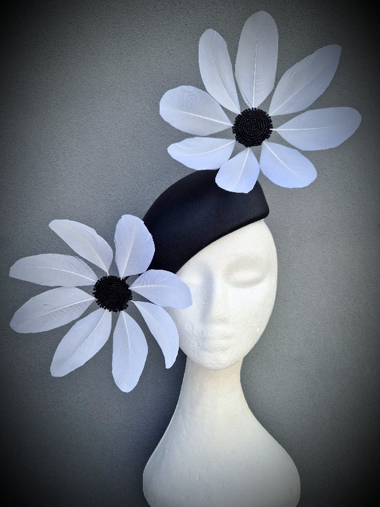 A stunning, hand blocked, standard hugger in black leather. Trimmed with hand cut black and white daisies.
