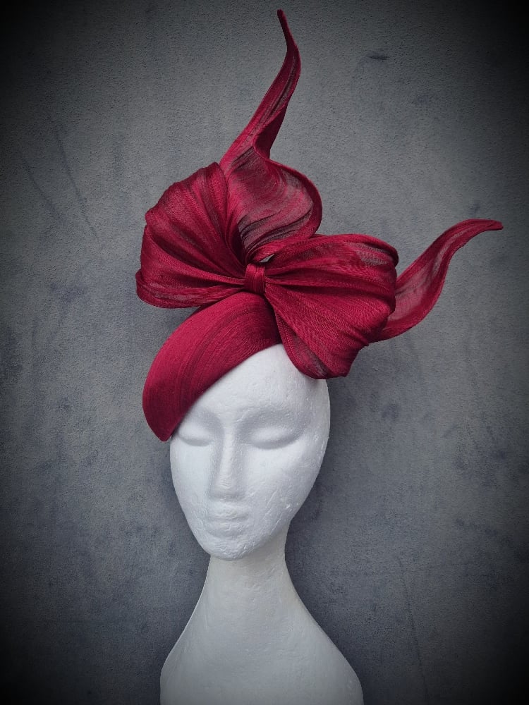 A gorgeous, easy to wear style that is perfect for races and weddings. The mini hugger sits perfectly to one side and the bow is a classic extension. This beauty is dark red but she can be made in many colours, inbox me for more info.