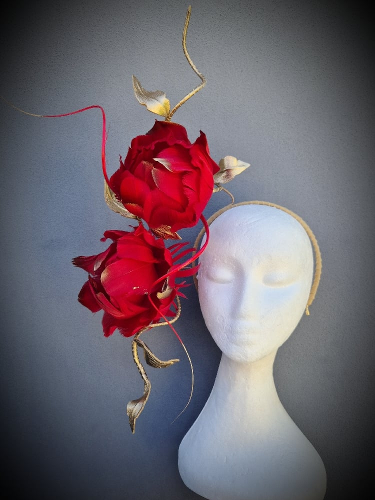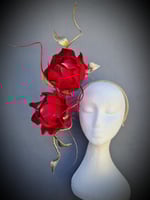 A lightweight and and easy to wear, floating floral crown in red and gold. Perfect for any season.