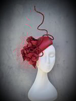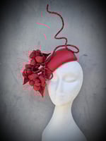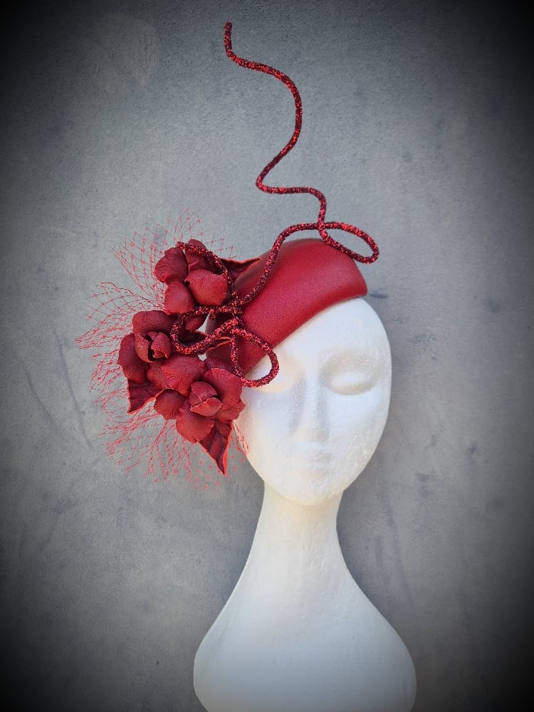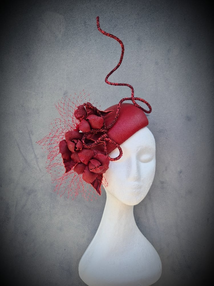 The perfect transeasonal ribbon red beauty. A stunning handblocked mini hugger base, trimmed with matching floral flowers and wired stem. She is lightweight and easy to wear and One-of-a-kind