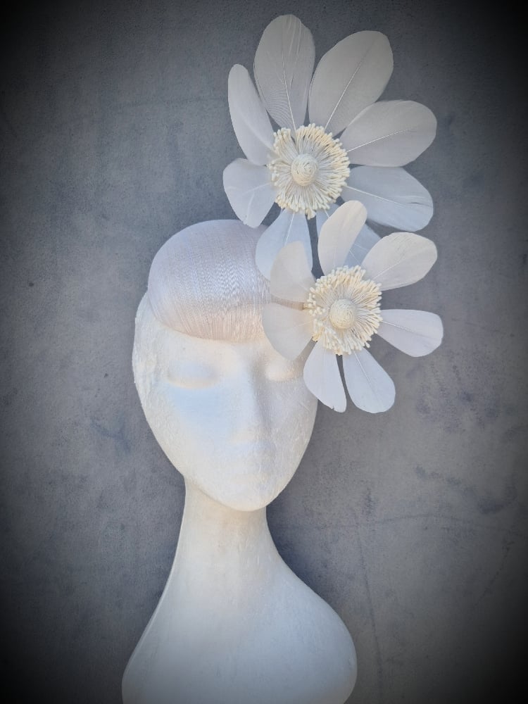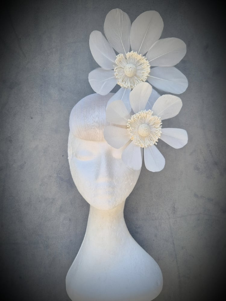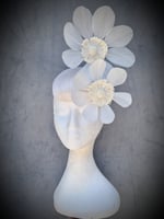 A cute, hand blocked ivory button, trimmed with matching flowers with stamen centres. Lightweight and easy to wear.
