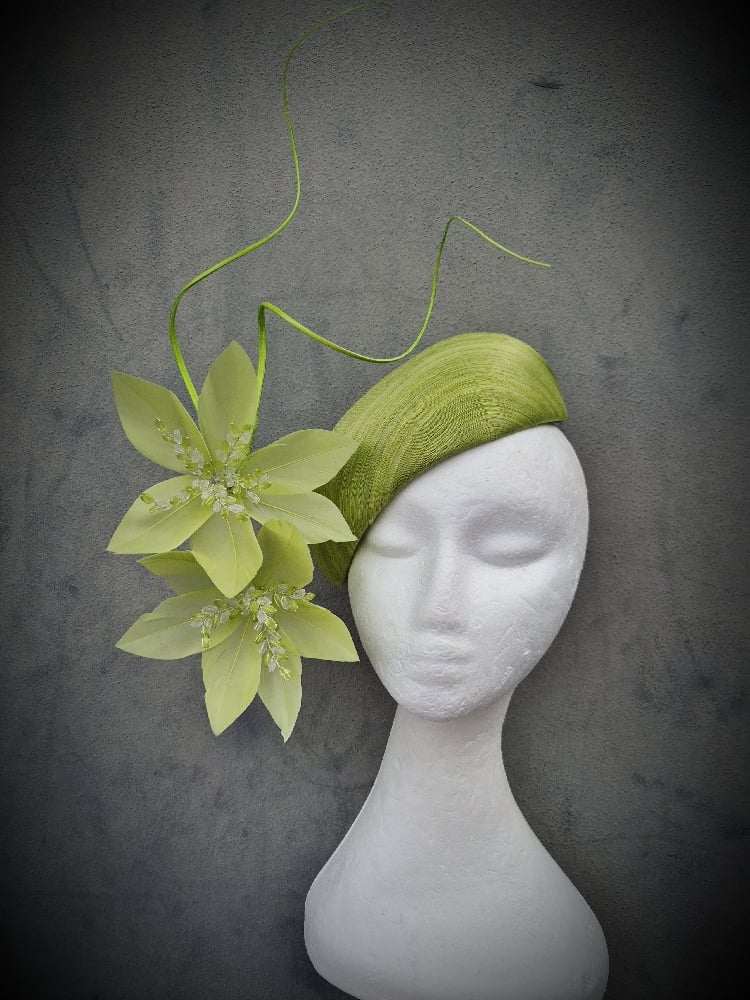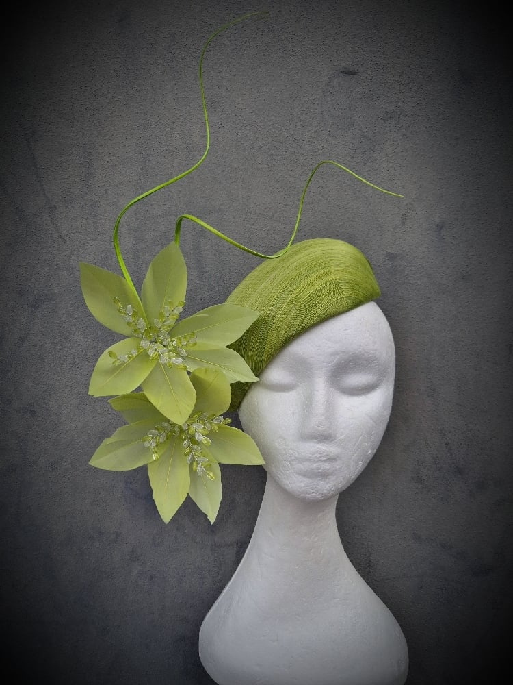I just love this shade of lime! Perfect for summer racing! Lightweight, easy to wear and one of a kind. A handblocked standard hugger base, trimmed with matching hand made floral and quills