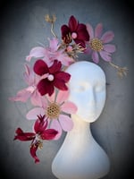 Soft floating feather floralas, hand crafted, lightweight and one of a kind. Such a beautiful piece. Colours include ice pink, mauve, burgundy and gold.