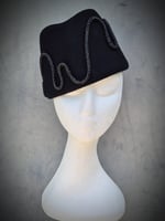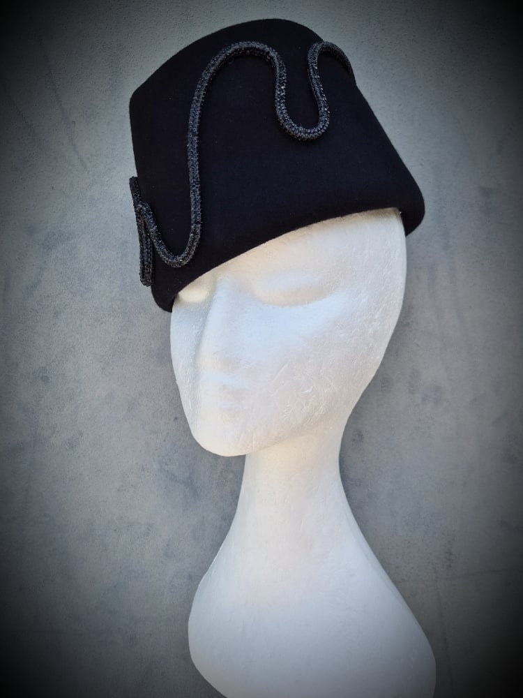 The ultimate comfort piece in Autumn Winter style. A handblocked hat crown base in black felt, trimmed with rhinestone tubing. Lightweight, easy to wear and ready for immediate delivery.