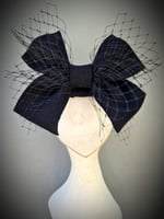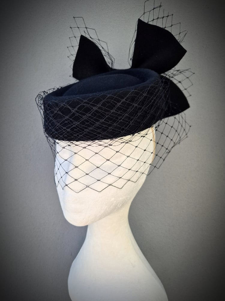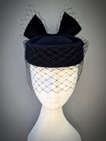 A cute, hand blocked pillbox base in black felt, trimmed with matching bow and veiling. Lightweight and easy to wear! This style is made to order so please allow a few days for production before delivery.