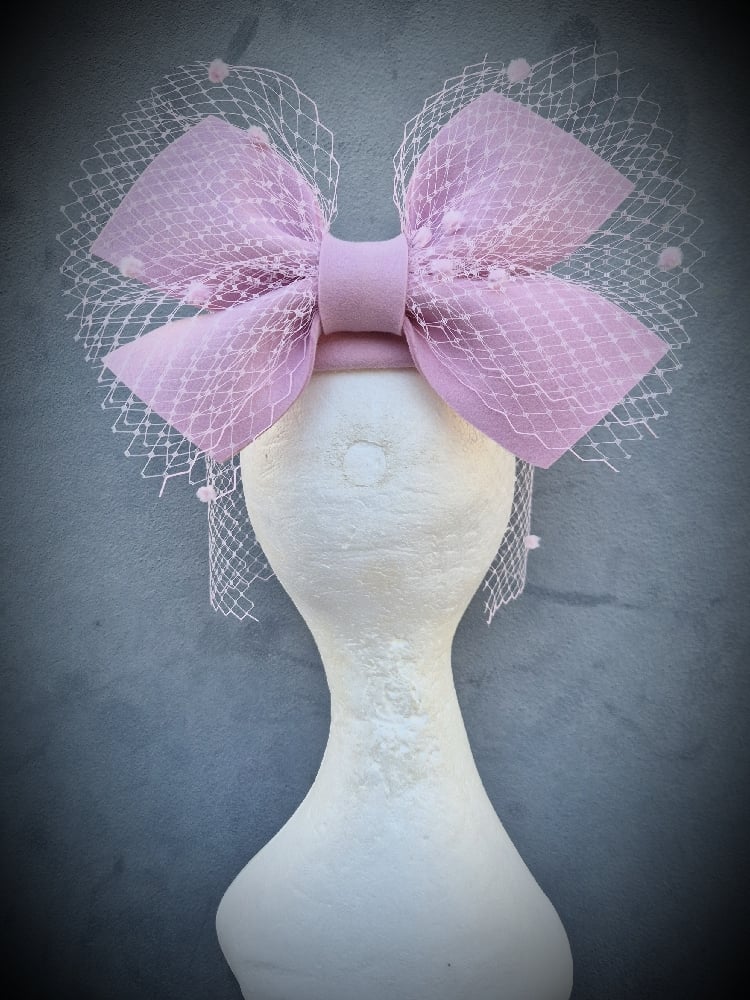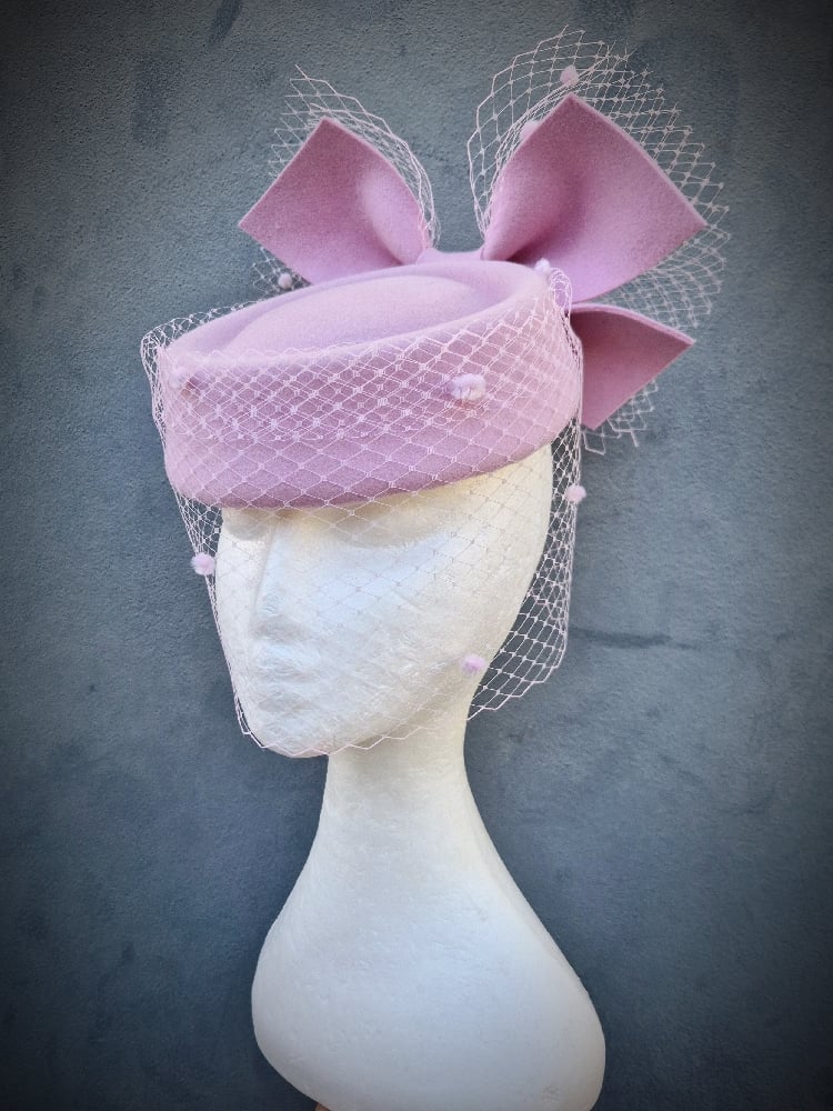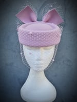 A stunning, handblocked, baby pink felt pillbox, trimmed with veil and bow. Perfect for Autumn or winter and so comfortable!